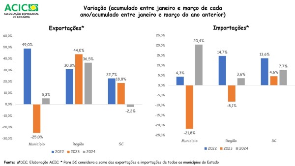 O comércio exterior também demonstrou aquecimento no primeiro trimestre de 2024, com crescimento de 36,5% nas exportações e de 3,6% nas importações por empresas do Sul catarinense.