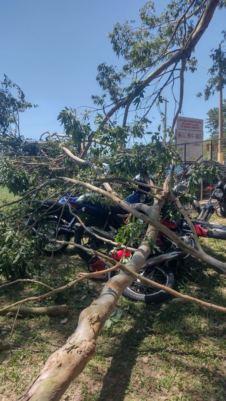 Na ocorrência, um jovem de 23 anos foi atingido e relatou aos socorristas que sentia muita dor na região lombar apresentando edema local, suspeita de ffraturano braço direito e algumas escoriações. O galho também atingiu algumas motocicletas.