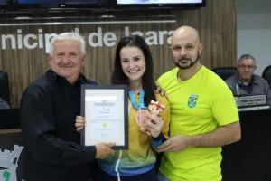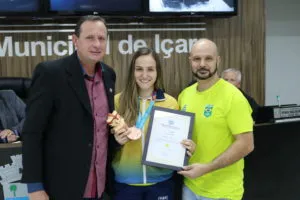 As caratecas Sabrina Pereira, Carolaini Pereira e Izabel Cardoso (representada pela atleta Thayane Teixeira) receberam moção de congratulações da Câmara Municipal de Içara na última segunda-feira, dia 19. As atletas conquistaram medalhas de bronze representando a seleção Brasileira no Kata equipe, no Pan-Americano realizado em Lima, no Peru.