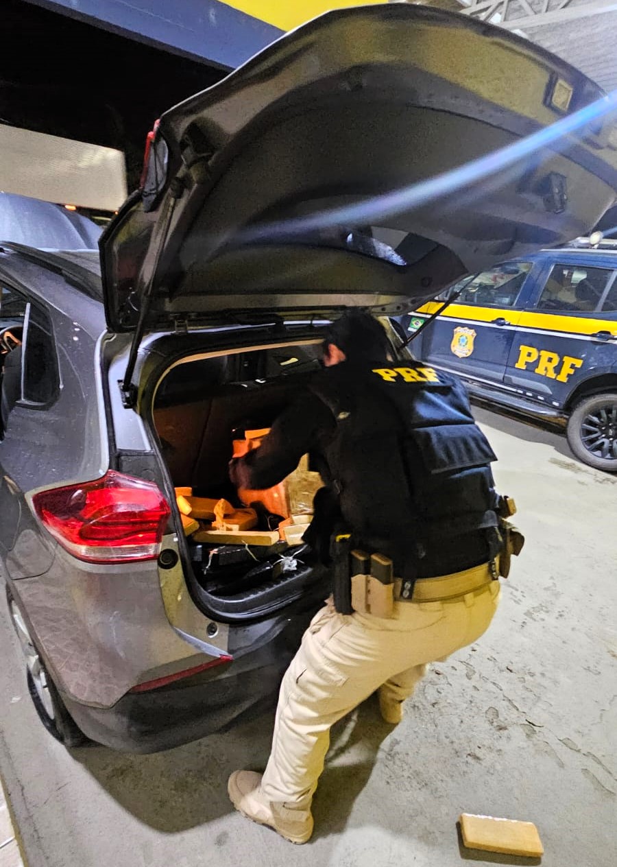 O veículo seguia sentido sul da rodovia quando recebeu ordem de parada. No entanto, o condutor desobedeceu e acelerou, realizando uma manobra de retorno e seguindo em alta velocidade no sentido norte. Depois de cinco quilômetros de perseguição, o veículo foi abordado pelos policiais. Durante a inspeção no interior do utilitário, os agentes encontraram os tabletes da droga no porta-malas e banco traseiro.