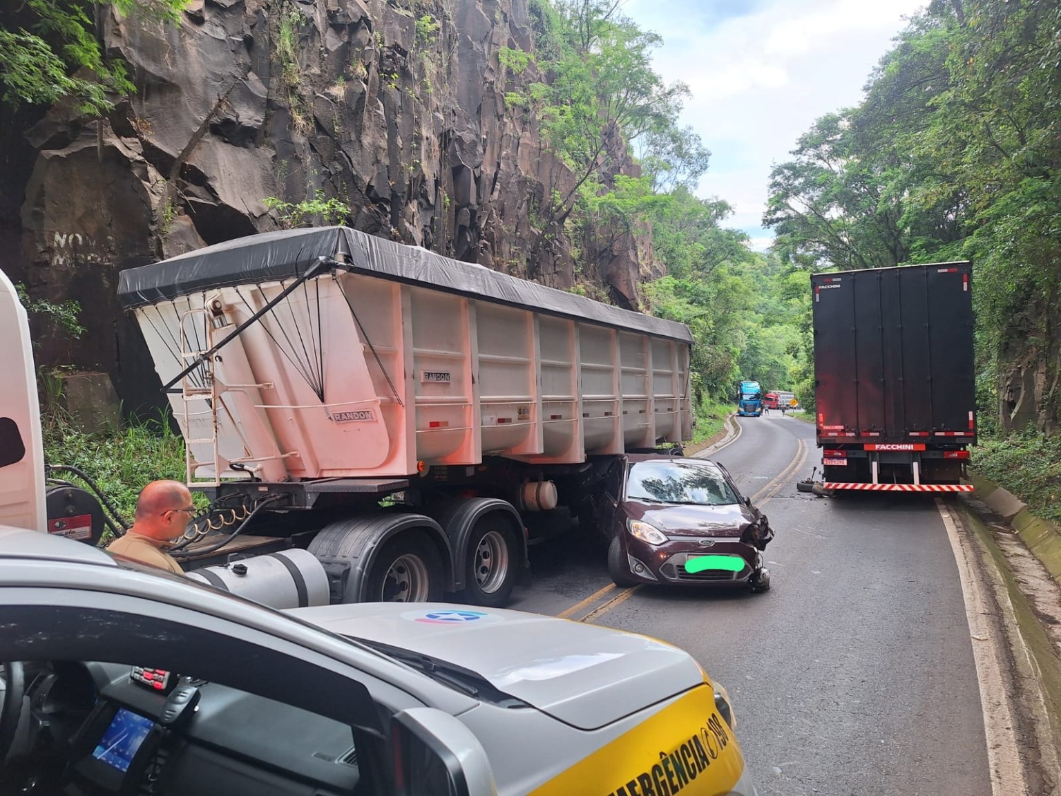 De acordo com a Polícia Militar Rodoviária, a ocorrência envolveu uma colisão traseira entre um caminhão Ford/Cargo 1422, conduzido por uma mulher de 32 anos, e uma motocicleta Honda/CG 150 Titan KS, conduzida por um homem de 25 anos.