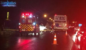 Um homem, de 79 anos, ficou preso às ferragens após o carro que ele conduzia colidir de frente com um ônibus que seguia no sentido contrário da Rodovia Paulino Búrigo (SC-445) por volta das 20h40 desta terça-feira, dia 6.