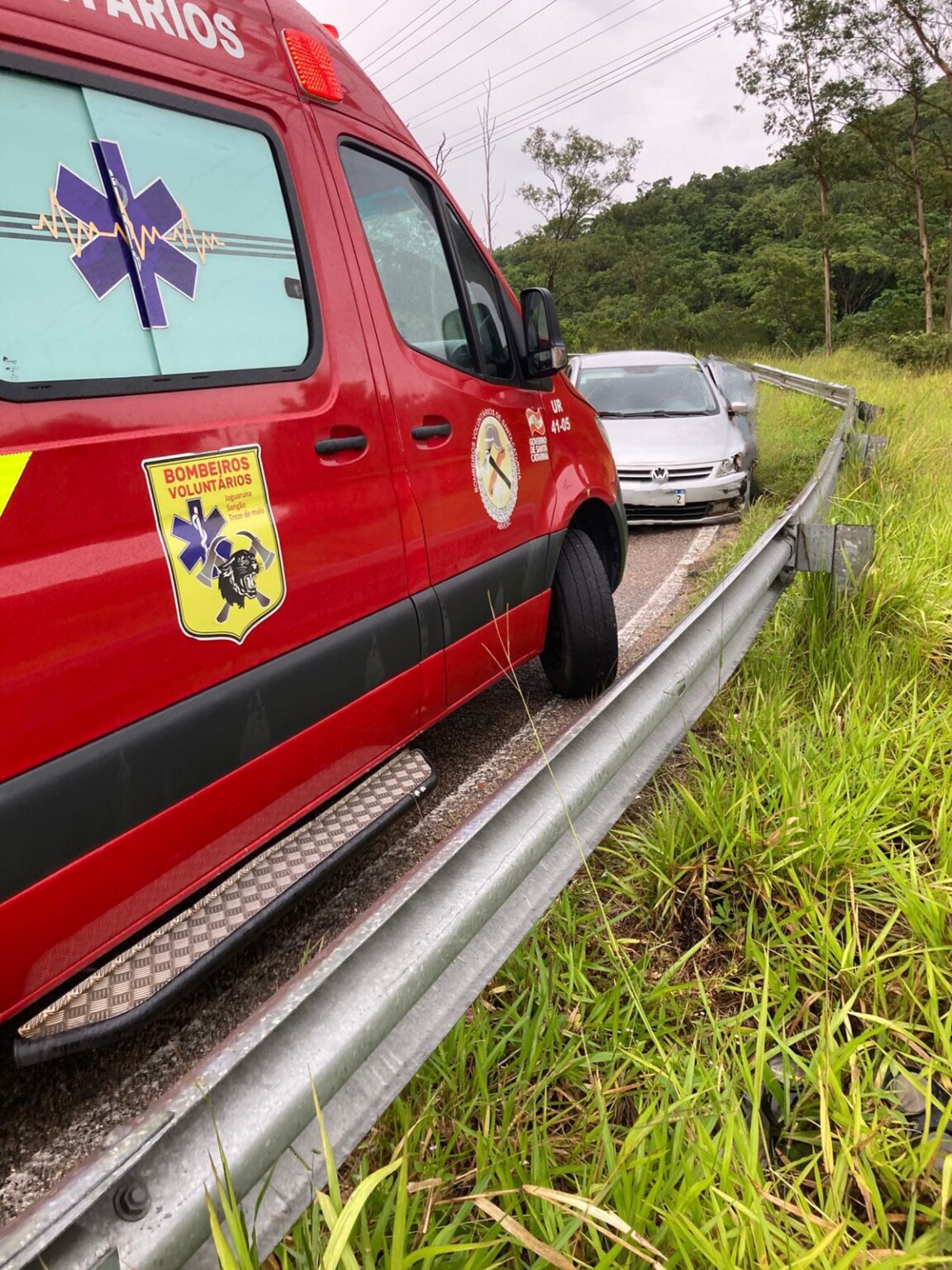 Nesta quarta-feira o corpo de bombeiros voluntários de Jaguaruna foi acionado para atender um acidente de trânsito (saída de pista seguida por colisão em guard rail).