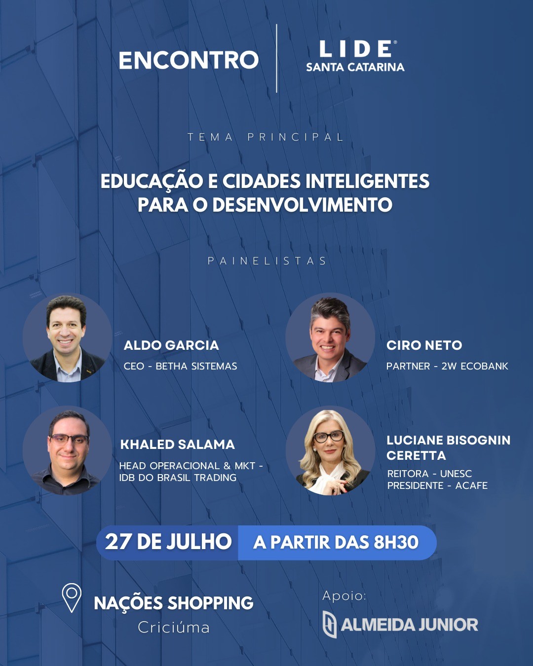 A reitora da Unesc, Luciane Cereta, que também é presidente do Sistema Acafe, trará ao evento o painel “Educação para o Futuro”. “O tema Educação e Cidades Inteligentes é estratégico para o futuro da sociedade e desenvolvimento socioeconômico. Precisamos de empresas e cidades voltadas para às pessoas”, finaliza Delton Batista, presidente LIDE SC.