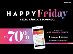 A Happy Friday acontece nos seis shoppings centers da Almeida Junior: Neumarkt e Norte Shopping (em Blumenau), Balneário Shopping (em Balneário Camboriú), Garten Shopping (Joinville), Continente Shopping (Grande Florianópolis) e Nações Shopping (em Criciúma). Outra facilidade apresentada aos clientes é a plataforma SHOPPromo. A solução integra as promoções das lojas no ambiente físico e virtual – o chamado omnichannel. O SHOPPromo reúne promoções dos seis shoppings em um único local. Em poucos cliques, é possível se cadastrar, selecionar seu shopping de preferência e escolher as promoções que estão cadastradas no aplicativo Almeida Junior. Depois, basta reservar o cupom e finalizar a compra retirando o produto na loja física do shopping selecionado.