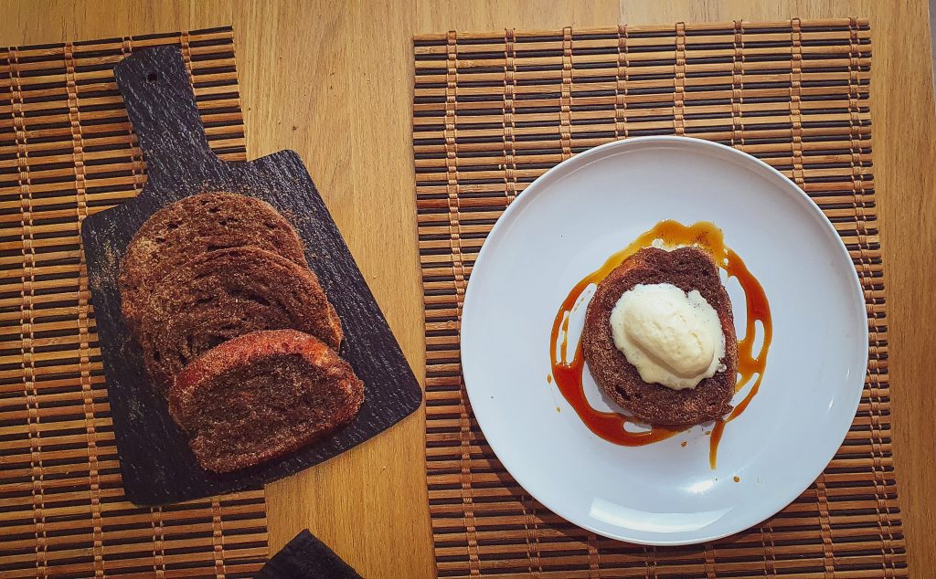 Ingredientes: Pão de brioche em fatias, 400ml de leite, 1\2 caixa de leite condensado, 6 colheres de sopa de cacau em pó, 2 ovos, açúcar a gosto, canela a gosto melado de cana e sorvete de creme.