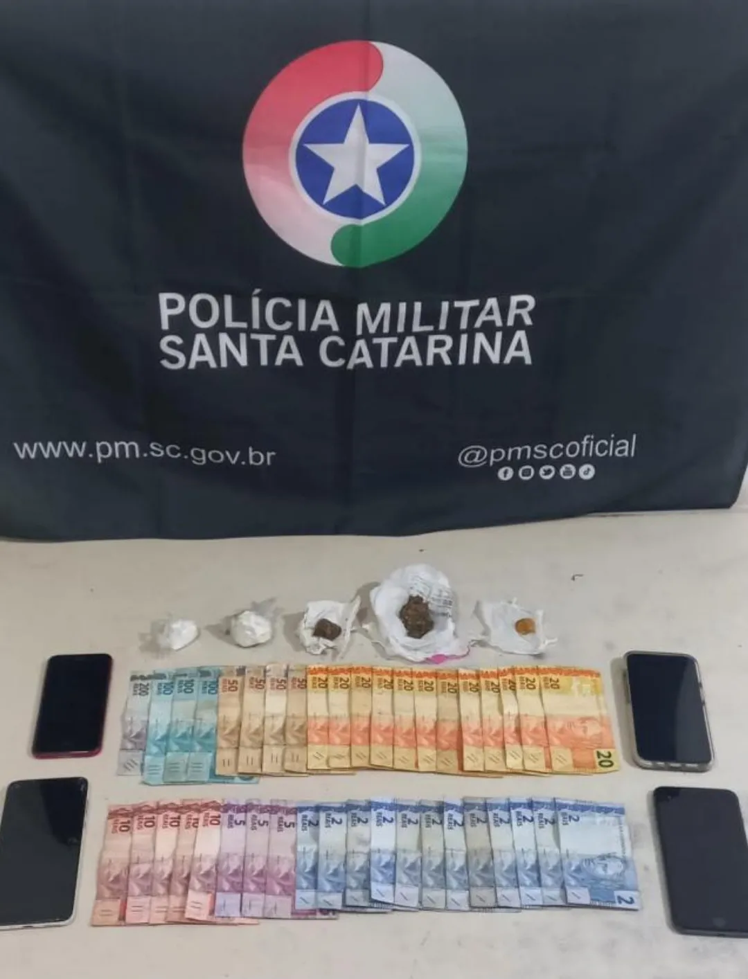 Já no bairro São Luiz, em Turvo, durante rondas, policiais do K-9 e da PM visualizaram dois homens em frente a uma residência conhecida pelo comércio de drogas. Ao perceberem a aproximação das viaturas, ambos correram para o interior do imóvel. No local, foi abordado um jovem de 19 anos e apreendido um adolescente de 16 anos. Com eles, foram encontrados maconha, crack e a quantia de R$ 2.613 em dinheiro. Os envolvidos foram encaminhados à Central de Flagrantes em Araranguá.