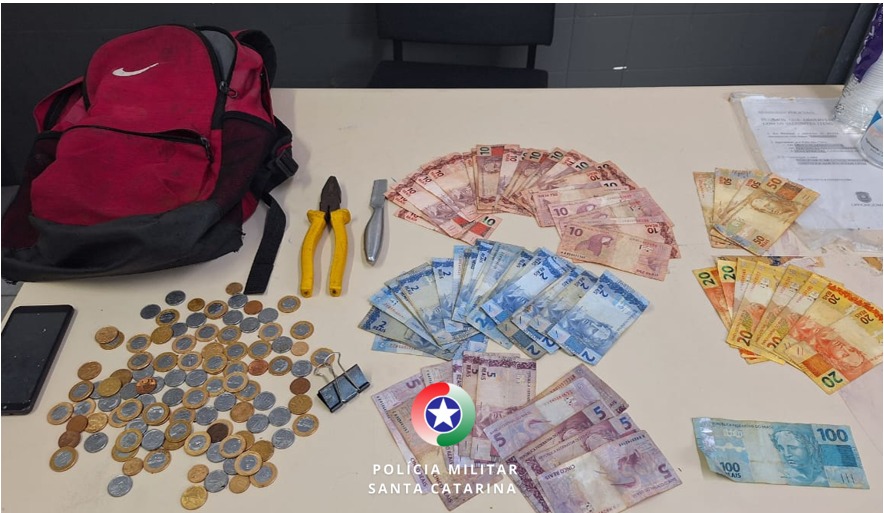 Após êxito na abordagem, o suspeito informou o local que havia furtado. Em sua mochila foi encontrada a quantia de 960 reais, além de ferramentas comumente empregadas em crimes de furto.
