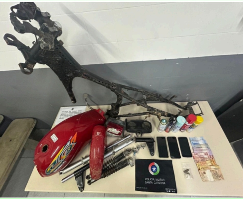 A Polícia Militar prendeu um jovem de 21 anos na tarde de quinta-feira (6) em Orleans, após flagrá-lo em uma residência onde foram encontradas peças de uma motocicleta furtada, pichações com siglas de facções criminosas e drogas. O caso ocorreu na Rua José Marcolino.