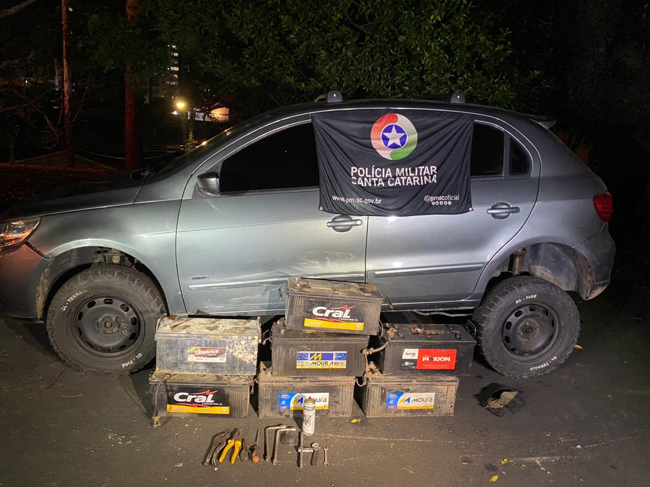 Deste modo os policiais efetuaram a abordagem onde estavam dois homens, um de 22 anos e outro de 26 anos. No veículo foram encontradas sete baterias de caminhão. Os abordados não souberam explicar a procedência e nem o porquê de estarem em posse das mesmas, ou seja, todas provenientes de furto a caminhões, e ainda com as marcas de fixação dos suportes.