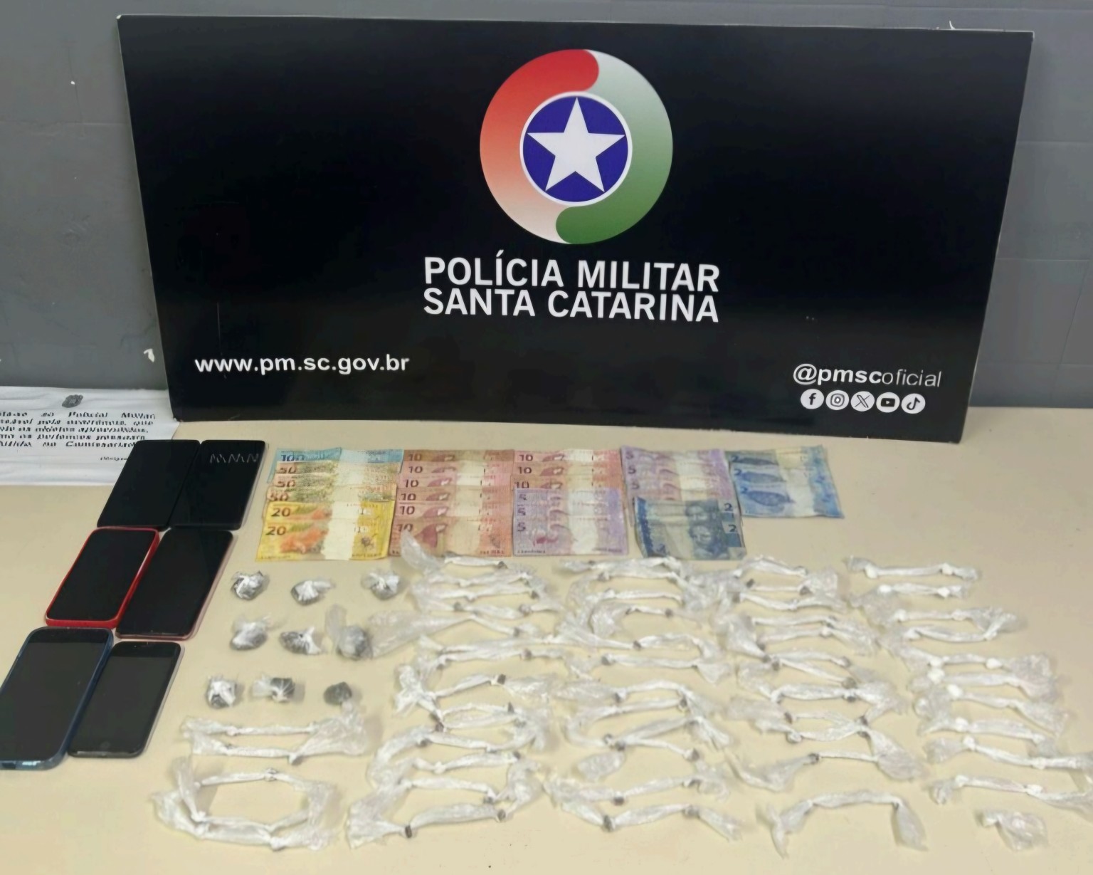 Com o apoio do Canil, os policiais localizaram porções adicionais de entorpecentes escondidas no forro da casa. Ao todo, foram apreendidos 36 gramas de crack, 25 gramas de maconha, 13 gramas de cocaína, R$ 425 em dinheiro, cinco celulares e materiais utilizados no preparo e fracionamento das drogas.