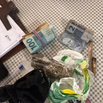 Dentro da residência, foi localizado em cima do hack da televisão, um Torrão grande de substância análoga a maconha, uma balança de precisão, 2 rolos de plástico filme para embalar as drogas, uma faca com resquícios de substância análoga a maconha utilizada no fracionamento, outras duas porções pequenas de substância análoga a raxixe e um pote de vidro contendo também substância análoga a maconha.