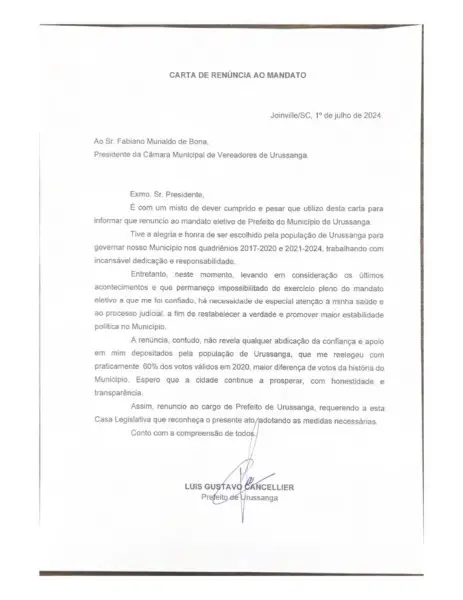 O prefeito de Urussanga, Luis Gustavo Cancellier, renunciou ao cargo nesta segunda-feira, 1. Ele estava afastado da função desde o dia 16 de abril, quando foi preso preventivamente na Operação Terra Nostra. A carta de renúncia foi entregue à Câmara de Vereadores.