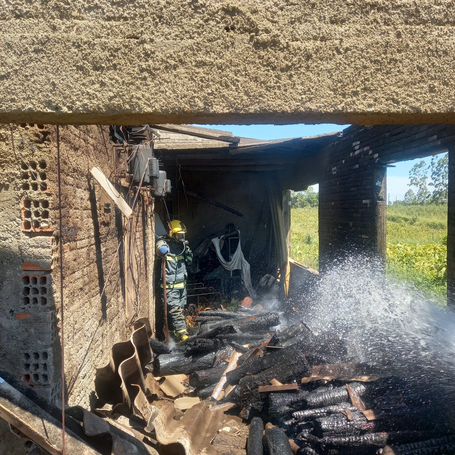 Para garantir a eliminação de focos remanescentes, os bombeiros realizaram o rescaldo utilizando uma linha de ataque com dois lances de mangueira de 1½” e aproximadamente 1.000 litros de água transportada.