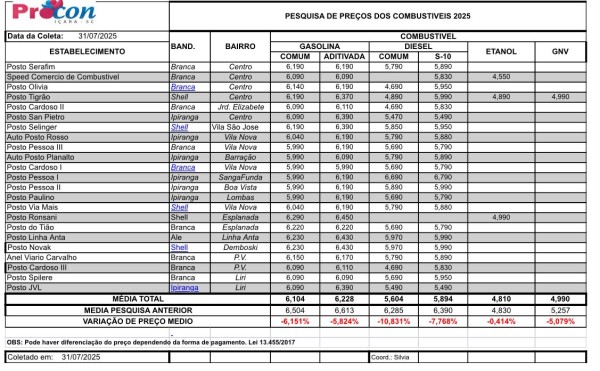 A pesquisa também apontou que a gasolina aditivada teve a maior variação percentual, de 7,8%, com preços que vão de R$ 5,99 a R$ 6,45. O etanol, por sua vez, registrou uma variação de 9,7%, sendo o menor preço de R$ 4,55 e o maior de R$ 4,99.