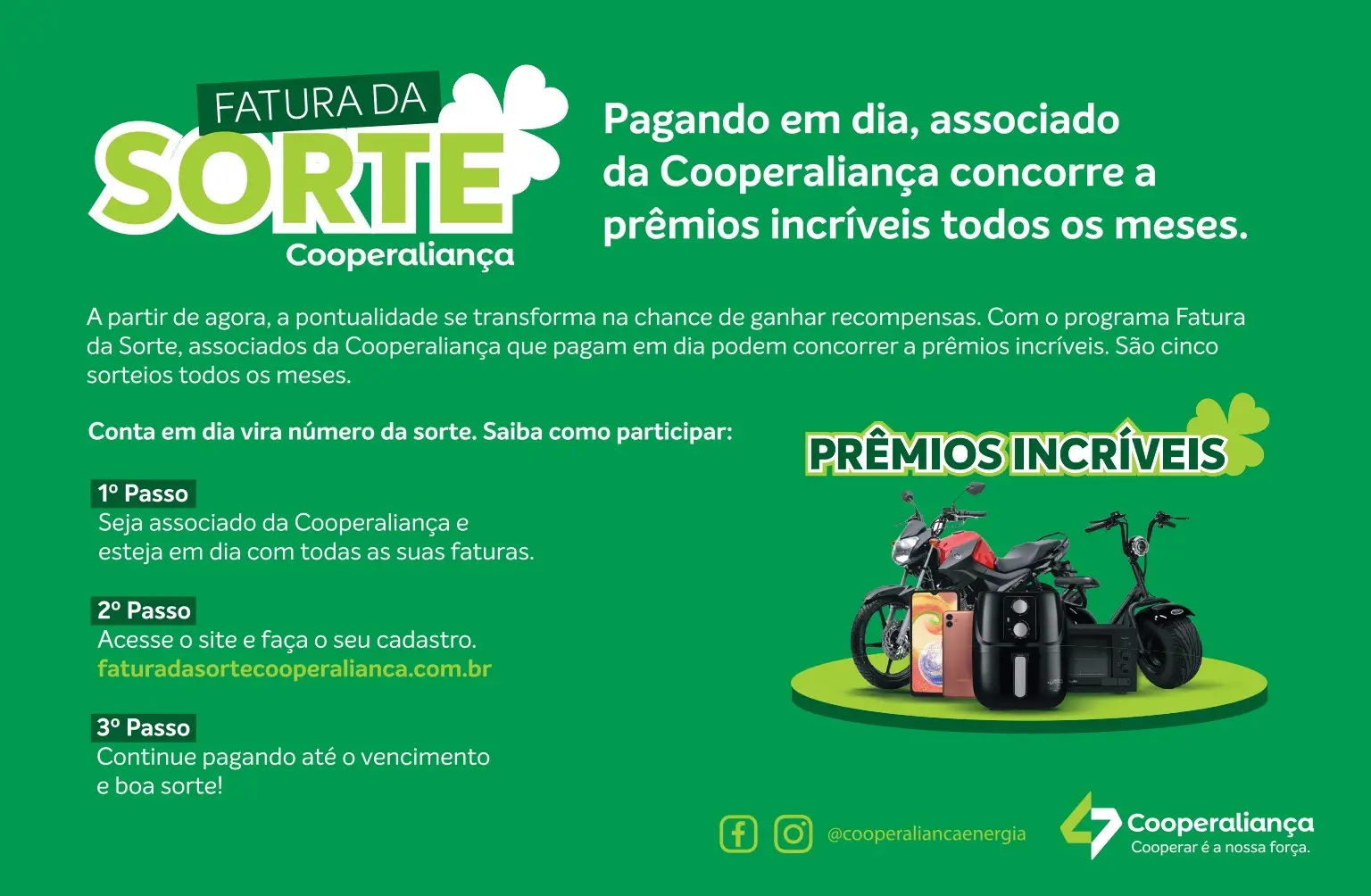 Os associados da Cooperaliança terão a oportunidade de concorrer a prêmios todos os meses até o fim do ano. A Cooperaliança lançou nesta segunda-feira, 01, o programa Fatura da Sorte. Serão sorteados cinco prêmios por mês e em dezembro o sorteio será especial, com 15 prêmios, incluindo três motos, uma scooter (moto elétrica) e um patinete elétrico.