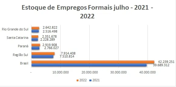 O percentual fica acima dos 32,05% registrados em Santa Catarina, onde há 2.351.678 empregados formalizados para uma população estimada de 7.338.473 habitantes. É superior também à média nacional, que está em 19,80% – são 42.239.251 empregos formais e 213.317.639 habitantes no país.