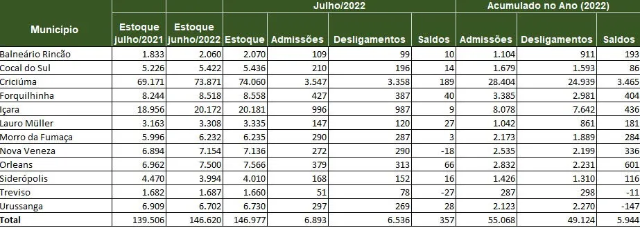 Por município, o melhor desempenho do ano na região segue com Criciúma, onde foram gerados 3.465 novos empregos até julho. A seguir, vêm Orleans, com 601; Içara, com 436; e Forquilhinha, com 404.
