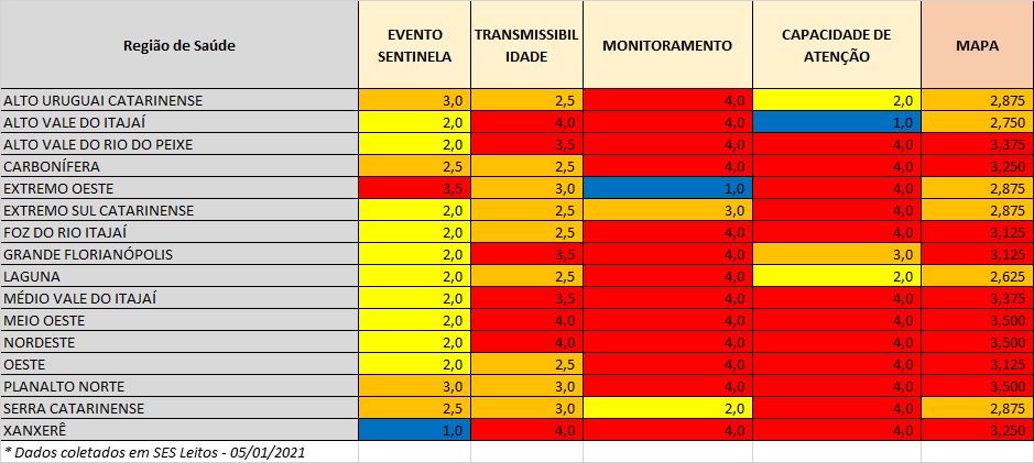 A Matriz de Risco Potencial divulgada nesta quinta-feira, dia 7, pelo Governo de Santa Catarina e Secretaria de Estado da Saúde (SES) classifica 10 das 16 regiões de saúde catarinenses como em alerta gravíssimo (cor vermelha) para transmissão do novo coronavírus. No boletim anterior, eram 12 locais neste patamar. As outras seis regiões estão em estado grave (cor laranja).