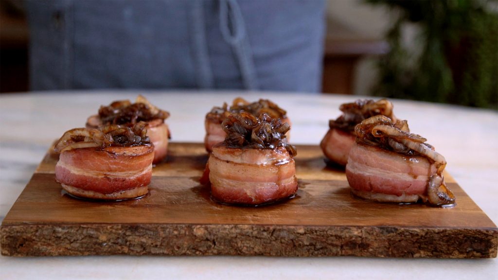 Modo de preparo: Enrolar uma fatia de bacon, prender com auxílio de um palito e temperar com sal e pimenta. Aquecer uma frigideira, regar com o azeite e selar os medalhões 3 minutos de cada lado. Com auxílio de uma pinça, virar o medalhão e dourar o bacon de sua lateral. Dispor em uma assadeira e levar ao forno preaquecido a 200 graus por, aproximadamente, 25 minutos. Na mesma panela dourar a cebola, caso necessário, retirar o excesso de gordura da panela. Juntar o açúcar e depois de caramelizada a cebola adicionar o vinagre e o vinho. Cozinhar por 5 minutos ou até que o molho esteja encorpado. Servir o medalhão e sobre ele dispor o molho.