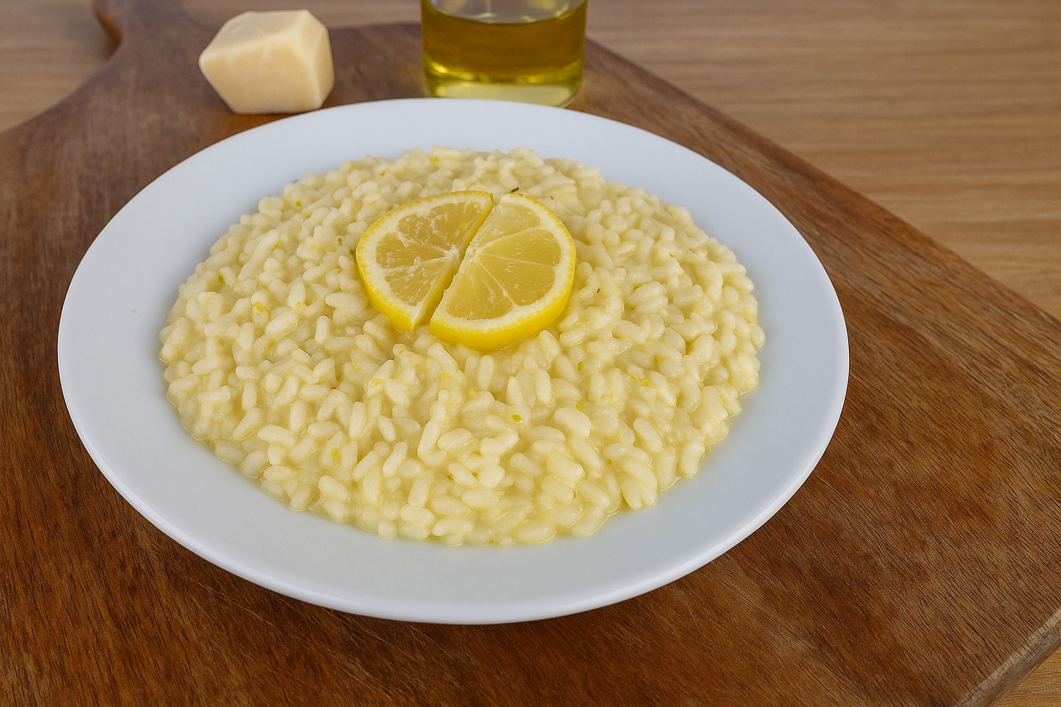 - Finalize o risoto:Quando o arroz estiver al dente e cremoso, desligue o fogo. Adicione a manteiga, o parmesão ralado na hora com microplano e as raspas de limão.