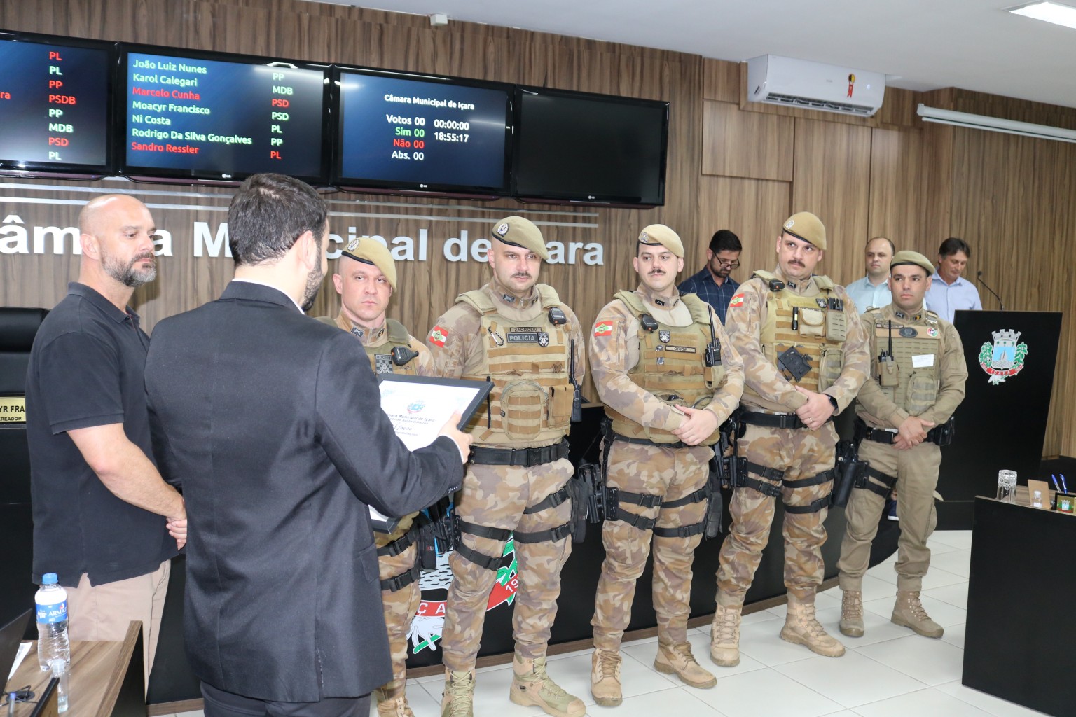 A equipe da Rocam (Rondas Ostensivas com Apoio de Motocicletas) do 29º Batalhão de Polícia Militar de Içara, recebeu moção de congratulações pelos inestimáveis serviços prestados ao município, nesta segunda-feira (08), na Câmara Municipal.