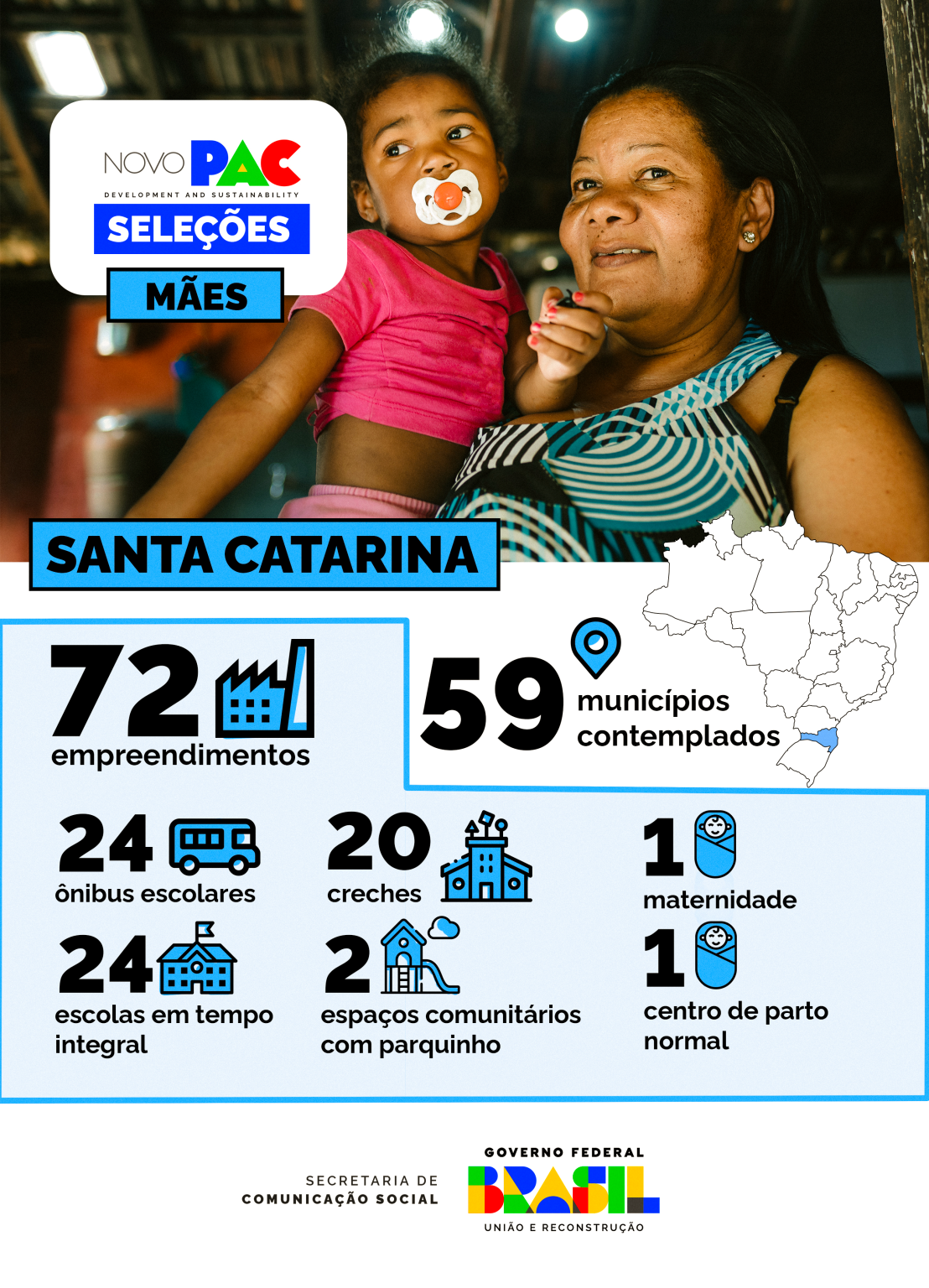 Em Santa Catarina, são 59 municípios contemplados. Estão previstas uma maternidade, um centro de parto normal, 20 creches / escolas de educação infantil, 24 escolas em tempo integral, 24 ônibus escolares e dois espaços comunitários com parquinho. Um total de 72 obras e equipamentos.