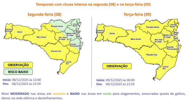 Ao longo da tarde e noite de segunda (08), há condições para temporais com chuva intensa, rajadas de vento e eventual queda de granizo, especialmente no Grande Oeste e nas áreas que fazem divisa com o Rio Grande do Sul. O risco é moderado a alto para ocorrências como destelhamentos, queda de galhos e árvores, danos na rede elétrica, alagamentos e enxurradas pontuais no Grande Oeste, Alto Vale do Itajái, Grande Florianópolis Serrana, Litoral Sul e Planaltos, e baixo nas demais regiões.