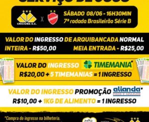 Segue a modalidade de ingressos para todos os jogos do Campeonato Brasileiro da Série B disputados no estádio Heriberto Hülse. Um lote de mil ingressos de arquibancada no valor de R$ 20,00 com mais cinco Timemanias marcando o Criciúma como Time do Coração estará disponível em cada jogo do Tigre no Majestoso. As Timemanias estarão disponíveis na secretaria anexa ao estádio. O horário de funcionamento será até o horário de início da partida. O clube lembra a importância de retirar o ingresso antecipadamente para evitar filas e que a secretaria não fecha ao meio dia.