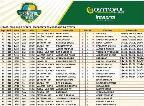 Três jogos abrem o returno da segunda fase da Copa Cermoful de Bocha, na noite desta quinta (11). Os confrontos desta fase são de mata-mata e as seis equipes melhores classificadas da Série Ouro e mais seis da Série Prata passam para a próxima fase.