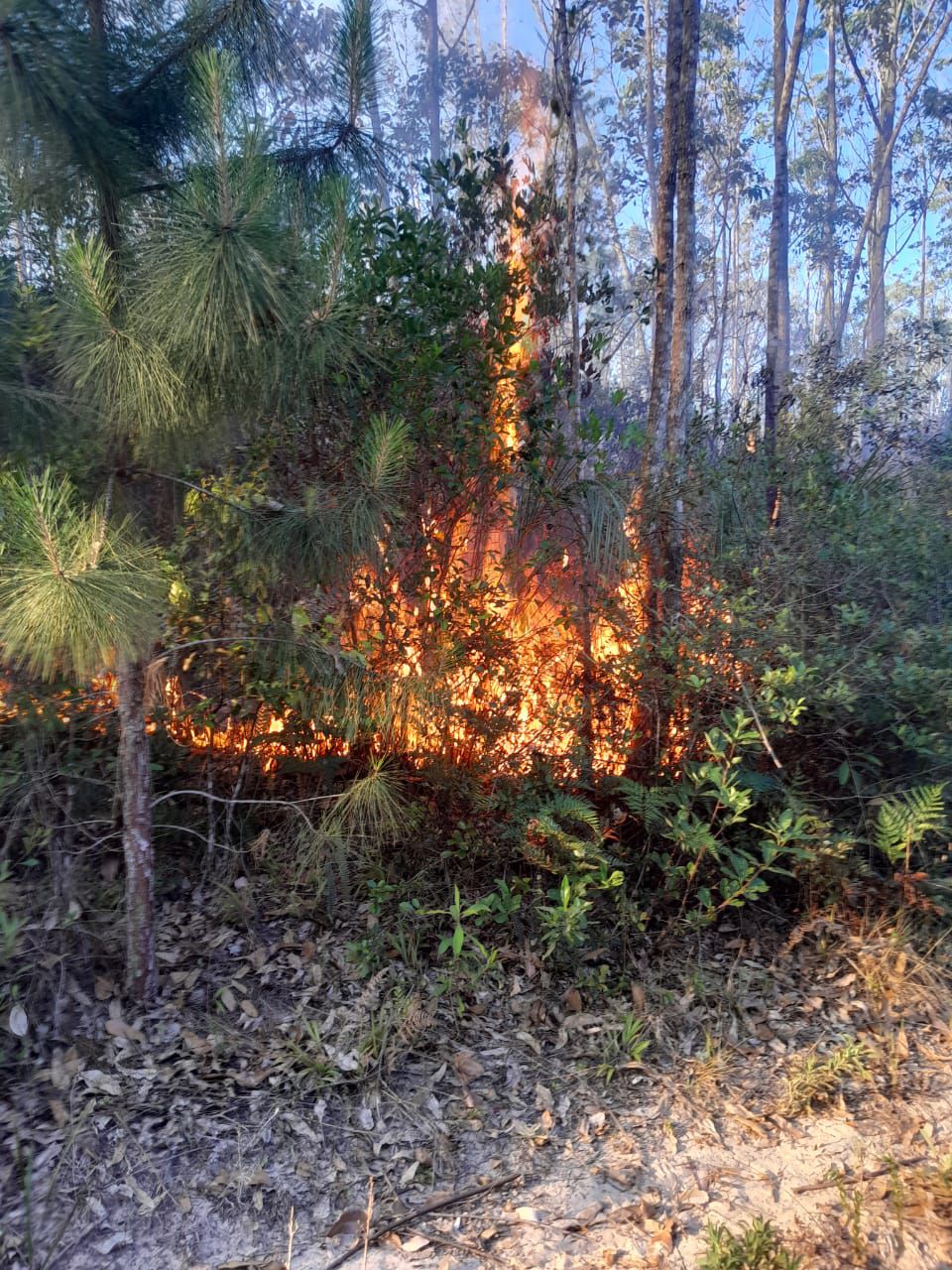 Nesta quinta-feira, o corpo de bombeiros voluntários foram acionados para uma ocorrência de incêndio em reflorestamento de eucaliptos e mata nativa na Rodovia Municipal Alicio José Bittencourt, bairro Arroio Corrente, em Jaguaruna.