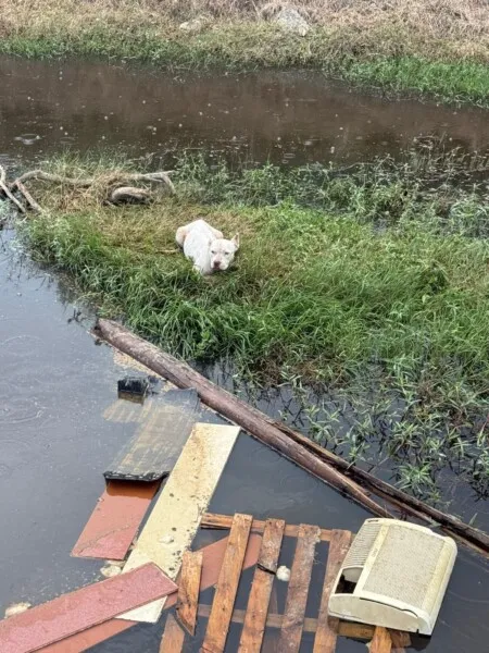 Ao chegar, a equipe constatou que se tratava de uma cadela da raça pit bull, que estava ilhada em um braço de rio, sem conseguir sair por conta própria. O animal apresentava sinais de debilidade.