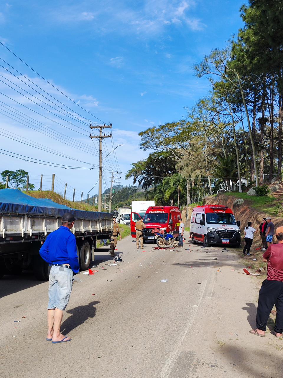 Já no período da tarde, às 15h30, o Bombeiro Voluntário de Jaguaruna solicitou apoio do SAER SAMU Aeromédico para atendimento a um homem de 58 anos, vítima de um acidente entre moto e caminhão na cidade de Treze de Maio. A equipe realizou atendimento avançado ao paciente, que já recebia reanimação cardiopulmonar (RCP) por parte dos bombeiros voluntários. Apesar do esforço das equipes, as lesões eram incompatíveis com a vida, e o paciente não resistiu.