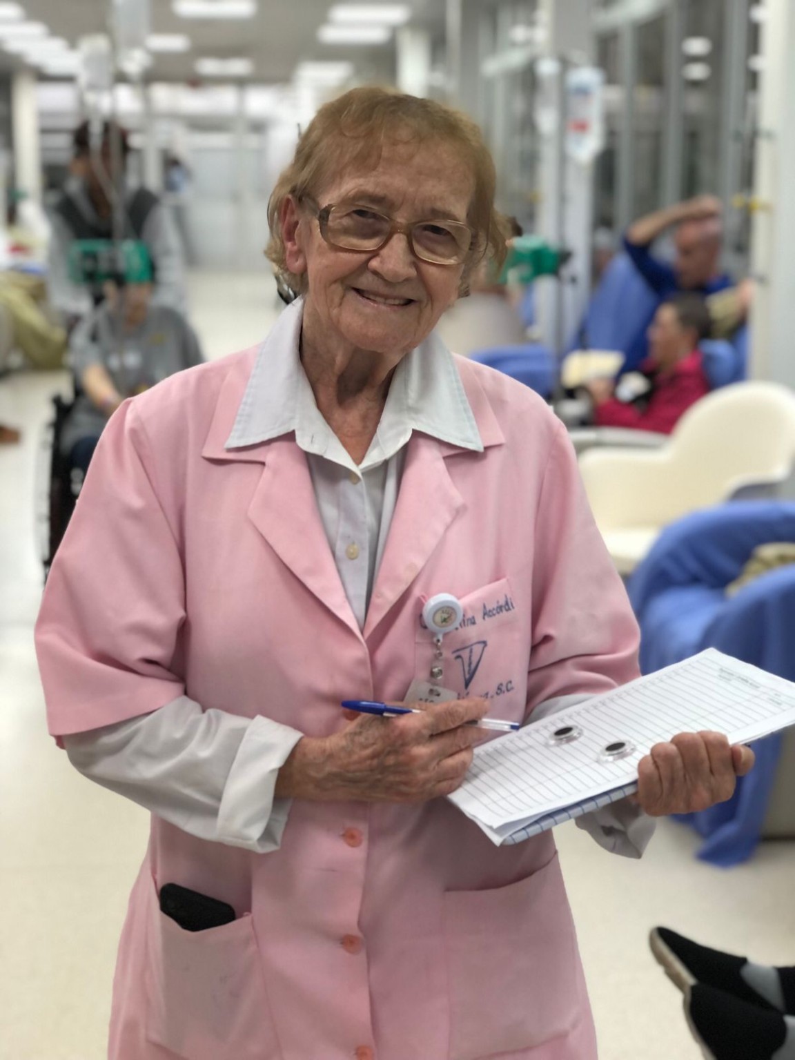Uma vida de dedicação e amor ao próximo. Para a senhora Carmelina Accordi, de 86 anos, a rotina da semana inclui, no mínimo, duas visitas ao Hospital São José, como voluntária da Rede Feminina de Combate ao Câncer. Nas conversas semanais, ela leva palavras de conforto, carinho, esperança e amor a quem passa por momentos difíceis, especialmente durante o tratamento da quimioterapia.